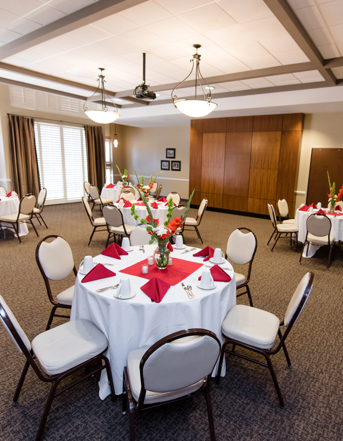 The Lutz Ballroom can accommodate 200 people to mix and mingle for hors d’oeuvres. 130 can sit and dine in comfort, while 100 people can enjoy buffet-style cuisine. The room also has a ceiling-mounted projector, drop-down screen and convenient A/V hook up. Ballroom events also have access to our charming rose garden patio just outside the room!