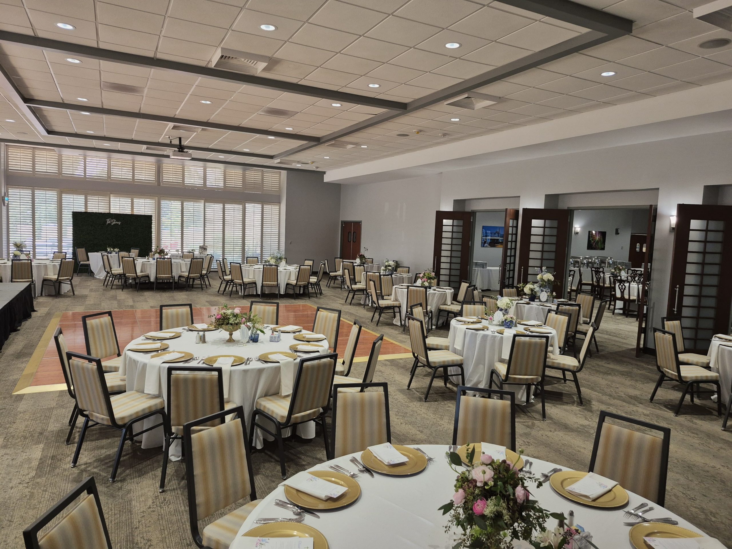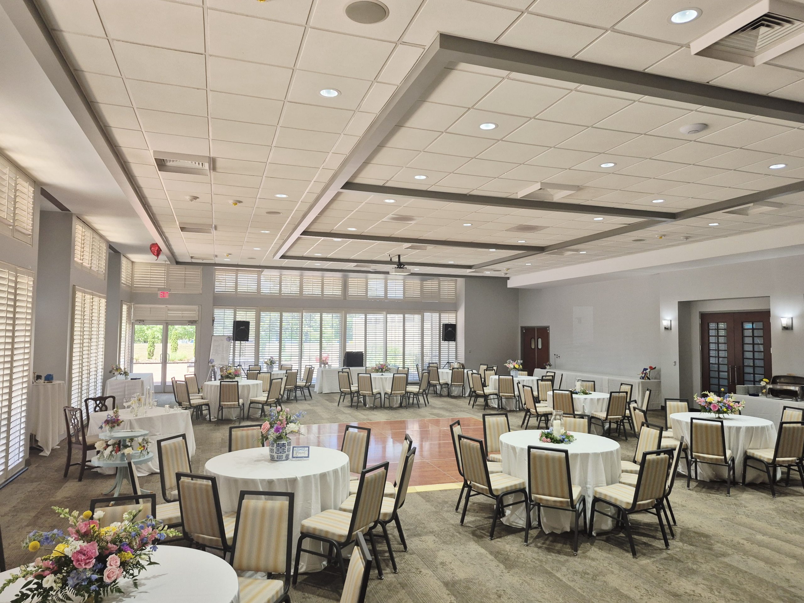 This multifunctional room has a beautiful view of our par-3 golf course and is perfect for business meetings or special social events. The room has a ceiling-mounted projector, drop-down screen and convenient A/V hook up. The terrace on the back side of the club allows guests to stroll outside for a bit after enjoying their meal indoors.